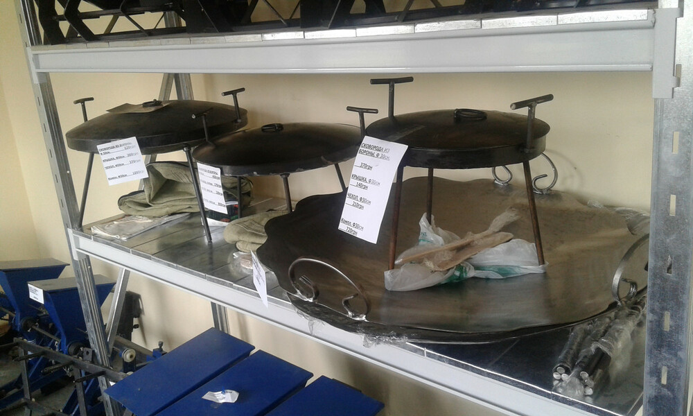 Есть сковороды больших (60см, 65см) и меньших (30см, 40см) размеров.
