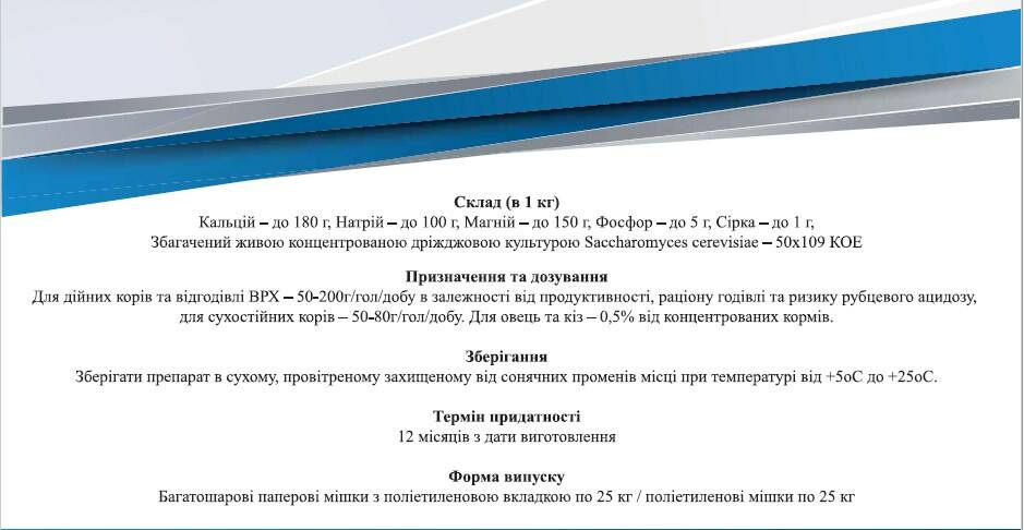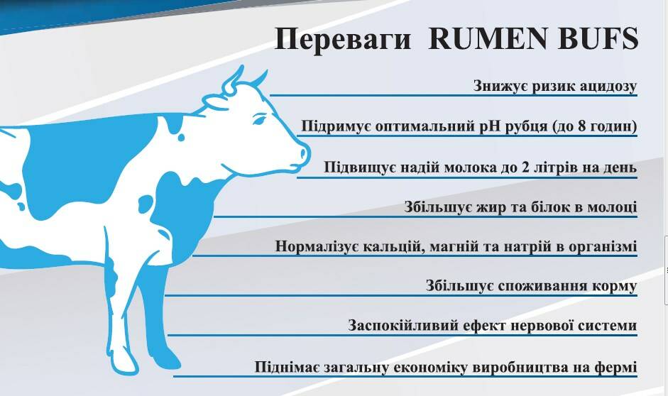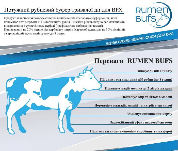 Данный продукт является высокоэффективным комплексным препаратом буферного действия, который помогает оптимизировать РН и стабильность рубца. Низкий уровень натрия дает возможность использования в сухостойный период (профилактика набухания вымени). При введении на 20% меньше чем карбоната натрия (пищевой соды), имеет на 30% более действенный и длительный эффект который длится до 8 часов.