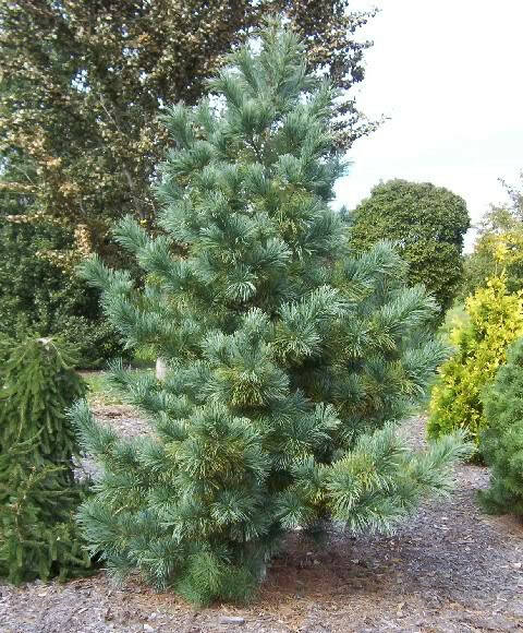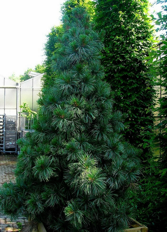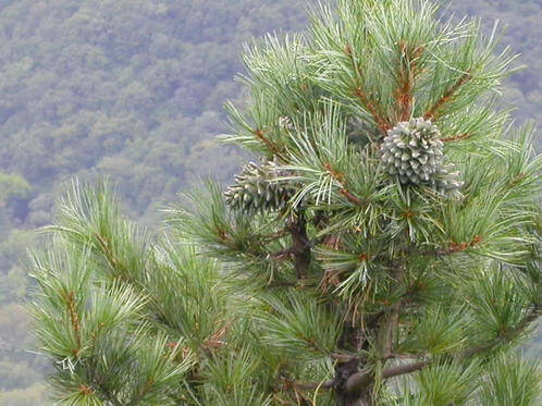 Хвоя: Сизовато-зелена, тригранна, довга, зібрана в пучки по п'ять голок.