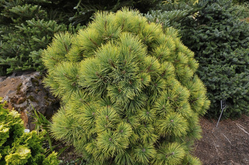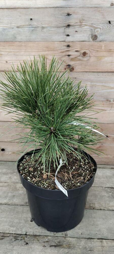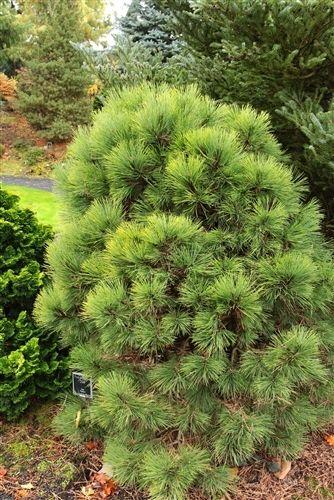 Дуже гарна сосна. Має сферичну, щільну форму крони. Голки товсті, довгі, темно-зелені. Річний приріст 5-7 см. Посадка бажана у місця, захищені від північних вітрів.