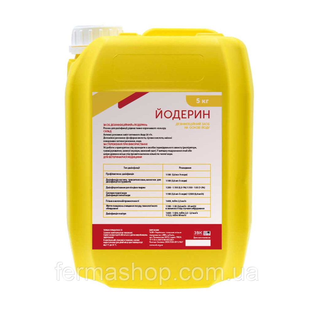 «Йодерин» эффективен при таких инфекциях, как болезнь Ньюкасла, болезнь Ауески, бешенство — из расчета 8 мл / л, везикулярной болезни поросят — 1,7 мл / л, ящур — 1,8 мл / л, туберкулез — 50 мл / л. Против PRRS или сальмонеллеза нужно использовать раствор препарата в соотношении 5,6 мл / л.