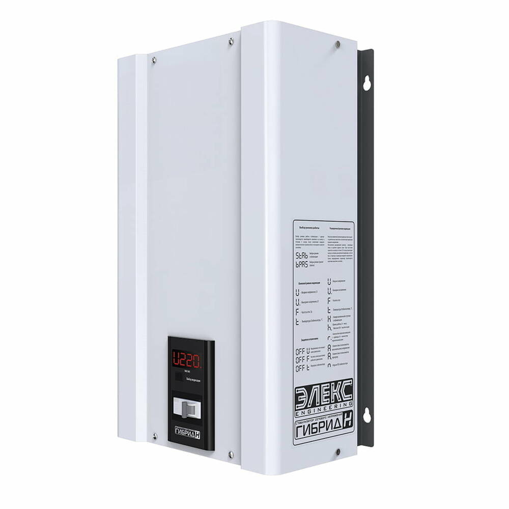 Однофазний стабілізатор напруги Гібрид У 9-1/32 v2.0 призначений для роботи в дуже нестабільних електричних мережах зі значними коливаннями напруги від 135 до 315 В (145-300 для виробів малої потужності). У цьому діапазоні апарат гарантовано видає на виході напругу в рамках 220 ± 7,5%, що забезпечується за рахунок використання 9 ступенів стабілізації.