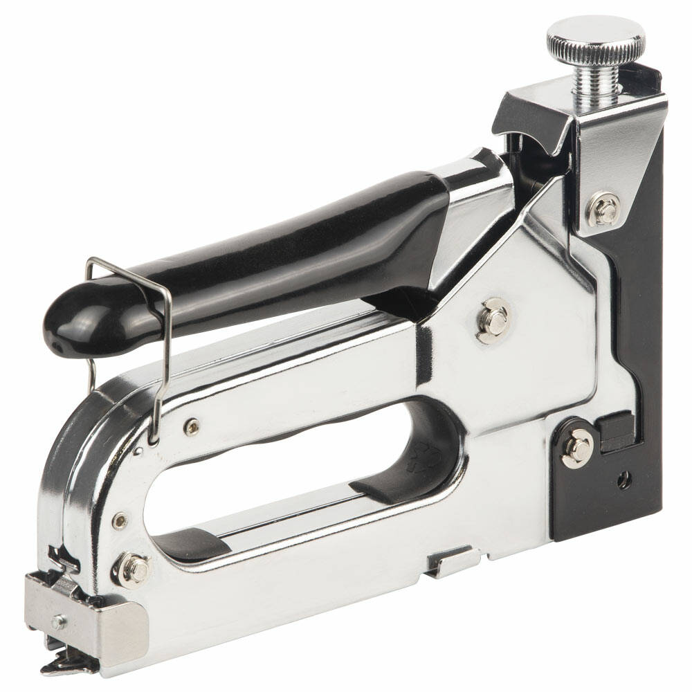 Універсальний інструмент, придатний для роботи зі скобами. Конструкція степлера з регулятором сили удару сприяє зручній роботі зі степлером та тривалому терміну служби.