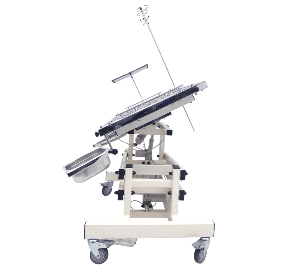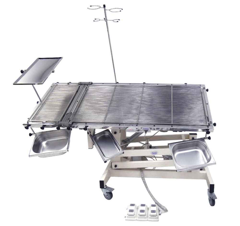 • Регульована стільниця: Забезпечує зручний доступ до операційного поля завдяки можливості нахилу в різних площинах. Виготовлена з високоякісної нержавіючої сталі для легкого очищення.