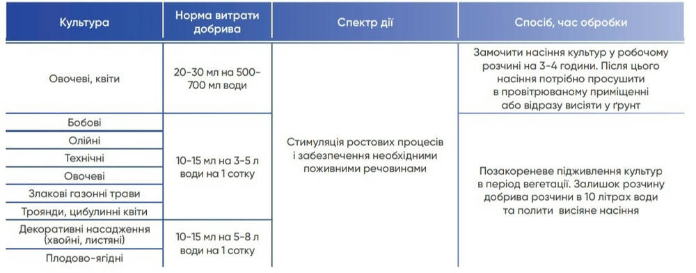 | Овощные, цветы | 20-30 мл на 500- 700 мл воды | Стимуляция ростовых процессов и обеспечение необходимыми питательными веществами | Замочить семена культур в рабочем растворе на 3-4 часа. После этого семена нужно просушить в проветриваемом помещении или сразу высеять в грунт |