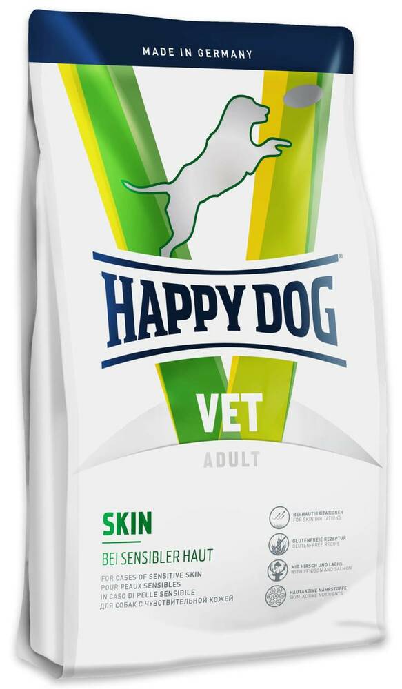 Happy Dog VET Diet Skin – використовується для регенерації шкіри під час подразнення. Безглютеновий корм із легко засвоюваною рецептурою та винятковими джерелами тваринного білка: оленини та лосося. Вживання вітамінів, мікроелементів та цінних Омега-3 та Омега-6 жирних кислот сприяють утворенню здорових клітин шкіри та посиленню шкірного бар'єру.