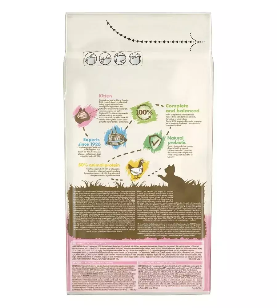 Сухий корм Cat Chow Kitten з куркою – це повнораціонне харчування для кошенят і також підходить для вагітних кішок та кішок у період лактації. Формула сухого корму Cat Chow ретельно створювалася, аби 50% білків у складі були тваринного походження, а натуральні інгредієнти у складі продукту робили продукт ще більш апетитним та смачним.