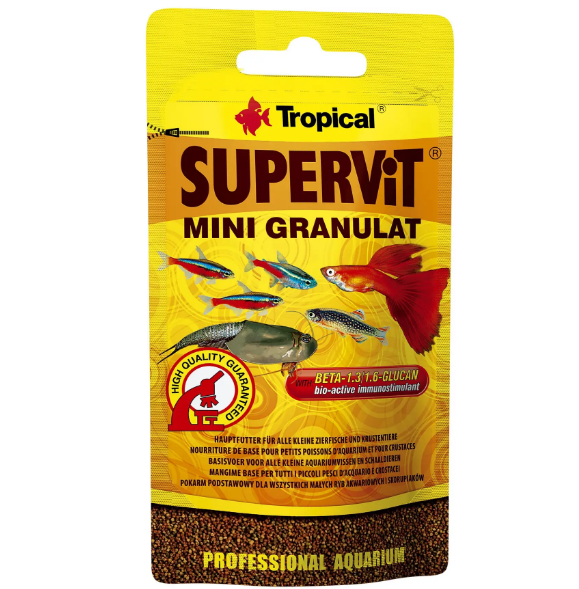 Supervit Mini Granulat - це багатокомпонентний корм у вигляді дрібних гранул, що повільно тонуть, призначений для щоденної годівлі всіх видів невеликих акваріумних риб і ракоподібних (зокрема Triops ssp.), а також інших невеликих мешканців акваріума. Спеціально підібрані харчові компоненти сприяють здоровому розвитку і красивому забарвленню риб. Добавка цеоліту сприятливо впливає на травну систему і видалення токсинів з організму риб. Годування: багаторазово протягом дня малими порціями.
