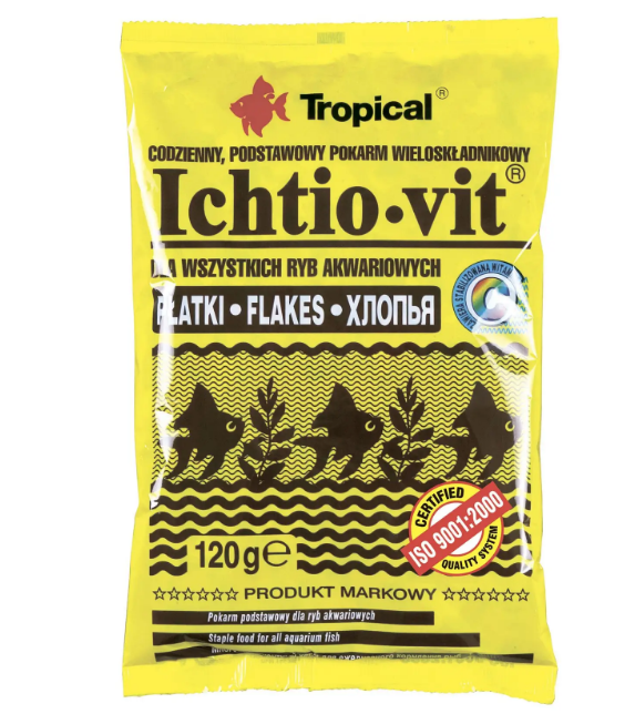 Багатокомпонентний корм у вигляді пластівців, отриманий з високоякісних, добірних, компонентів тваринного і рослинного походження. Призначений для щоденного годування всеїдних риб. Оптимально збалансований склад і відповідний набір вітамінів і мікроелементів забезпечує правильний ріст і розвиток риб, а також покриває їх енергетичні потреби. Ichtio-vit особливо охоче використовують у промисловому рибництві, поряд зі спеціальними кормами лінії premium та professional.
