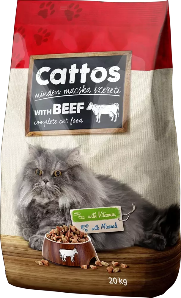 Сухий корм для котів Cattos Complete Cat Food with Beef — це повнораціонний сухий корм для щоденного годування дорослих котів. Корм виготовлений на основі м’яса яловичини, яке є джерелом поживного білка та допомагає підтримувати енергійність і добрий фізичний стан тварини.