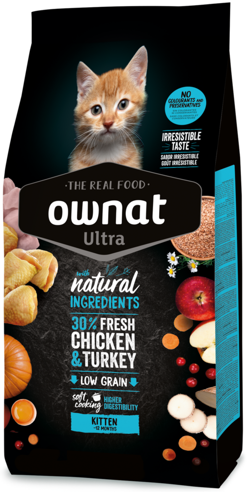 Ownat Ultra - рекомендований для задоволення харчових потреб кошенят до 12 місяців. Містить 30% свіжого м’яса курки та індички, має високий вміст білка для забезпечення оптимального зростання. Містить лососеву олію як джерело омега-3 жирних кислот (DHA), що сприяють розвитку мозку та підтримують здоровий зір.