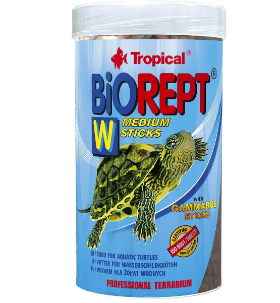 Biorept W - це багатокомпонентний корм, призначений для щоденного годування всеїдних і м'ясоїдних земноводних і водних черепах. Містить добавку ракоподібних, зокрема гамаруса, що збагачує корм цінним білком, хітином і поліненасиченими жирними кислотами (омега-3 і омега-6). Добавка цеоліту сприятливо впливає на травну систему і видалення токсинів з організму.