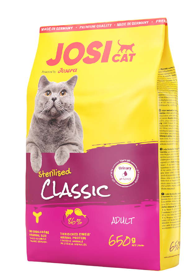 JosiCat Sterilised Classic смачна їжа для стерилізованих кішок. Збалансований вміст мінералів сприяє рівню рН сечі 6,0-6,5, що запобігає утворенню сечових каменів. Повнораціонний сухий корм для дорослих котів