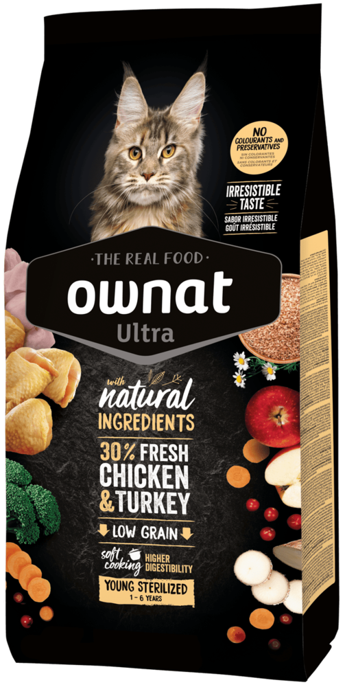 Ownat Ultra - повноцінний і збалансований корм для дорослих стерилізованих котів віком до шести років. Цей рецепт зі зниженим вмістом жиру містить 30 % свіжого м’яса курки та індички, а також має високий вміст клітковини, що забезпечує відчуття ситості та допомагає підтримувати оптимальну вагу кота.