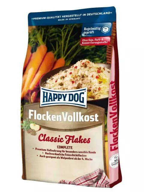 Happy Dog Flocken Vollkost - повноцінний, корисний корм класу Преміум, який легко засвоюється. Він розроблений для собак з чутливим травленням, а також його можна давати як прикорм для цуценят віком від 3 тижнів. Містить збалансовану кількість тваринних білків та жирів, а також вуглеводи, які легко засвоюються, у формі спеціальних тонких пластівців з дозрілої на сонці кукурудзи. Пластівці завжди слід змішувати з теплою водою до кашоподібної консистенції.