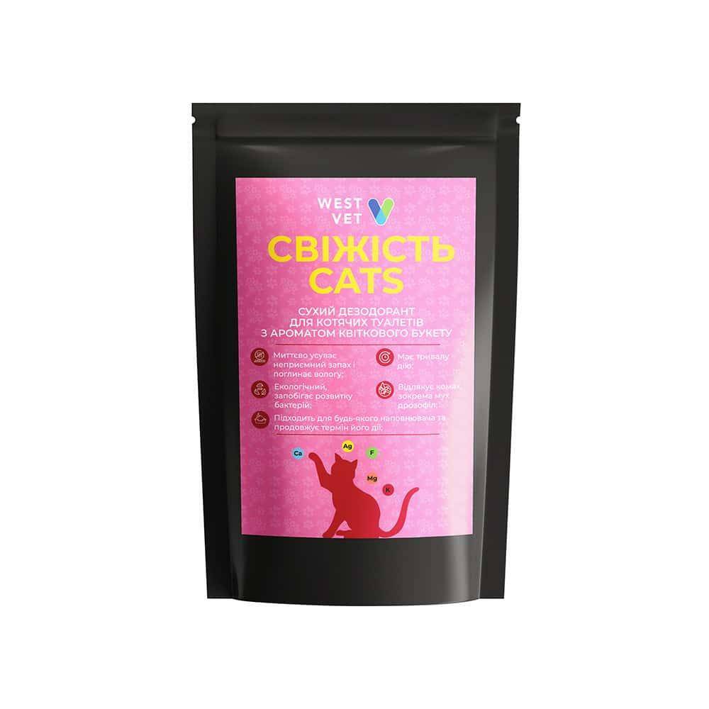 Сухий дезодорант для котячих туалетів «Свіжість Cats Квітковий букет» миттєво усуває неприємний запах, збільшує термін дії наповнювача для туалету і запобігає розвитку хвороботворних бактерій та мікроорганізмів у лоточку. Підходить для будь-якого наповнювача, ефективно поглинає вологу, з ароматом квіткового букету, не токсичний.