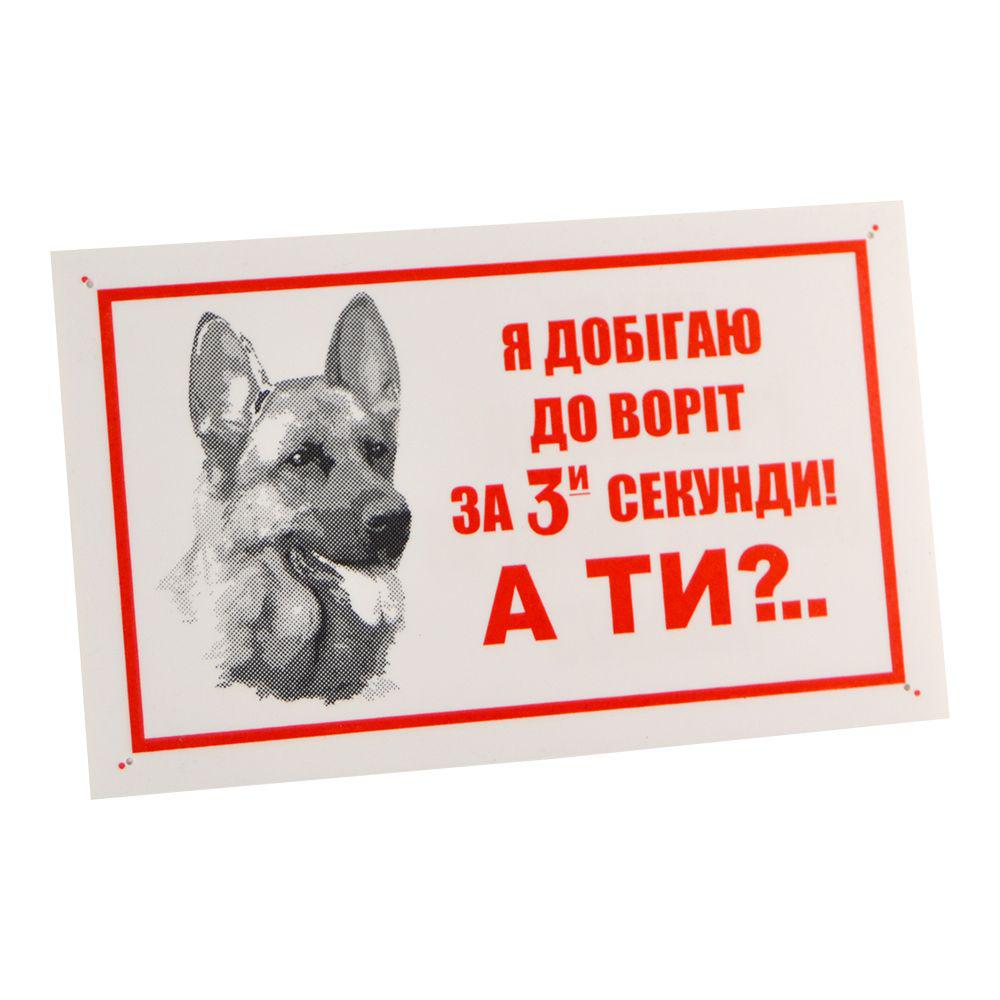 Табличка «Я добігаю до воріт за 3 секунди. А ти?..» виготовлена з високоякісного пластику і прикрашена фото німецької вівчарки, яку вважають еталоном сторожової собаки. Для поліпшення експлуатації виріб з усіх чотирьох сторін обладнано спеціальними отворами для кріплення.
