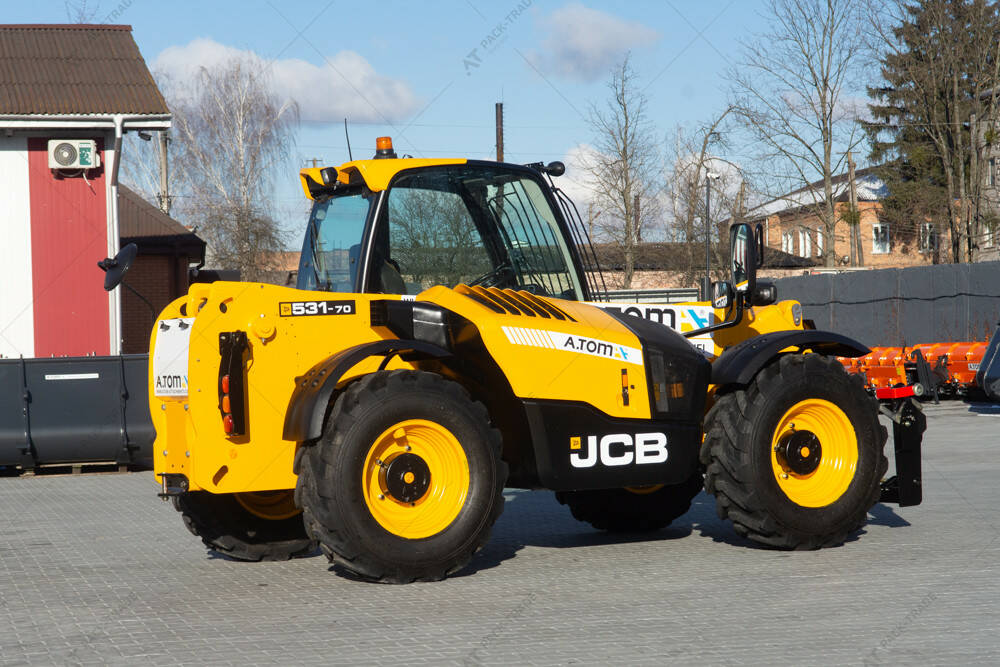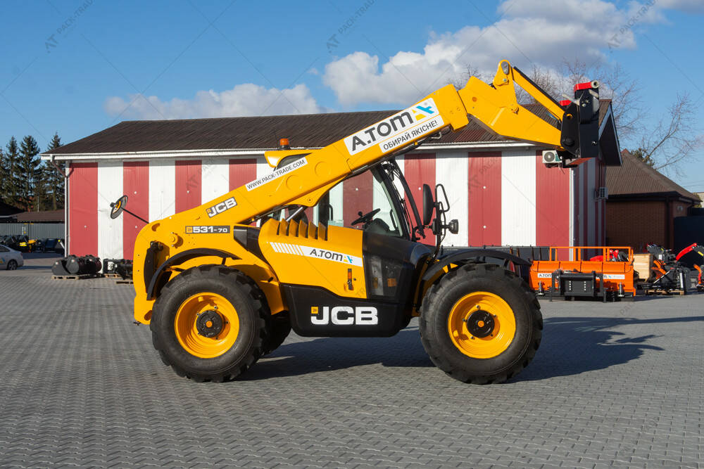 Навантажувач б/в JCB 531-70, 2021 р/в, з напрацюванням 1279,1 м/год. Двигун 55 кВт Turbo. Вантажопідйомність 3100 кг. Висота підйому 7 м. Вага 7720 кг. Шини 15.5/80-24. Кондиціонер, джойстик. Гідрофаркоп. Задній гідравлічний зчіпний пристрій, задній додатковий гідравлічний вихід, гідравлічні гальма, розетка для підключення причепа. Переднє додаткове робоче світло, захисна решітка лобового скла та даху кабіни, додатковий захист карданів та КПП.