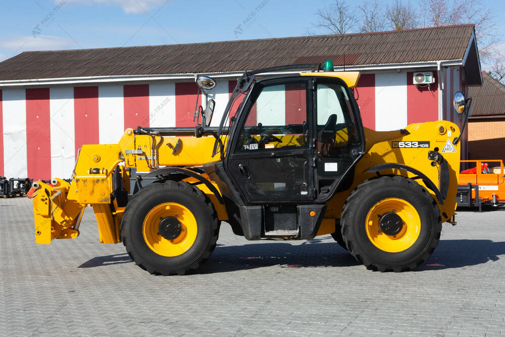 Навантажувач б/в JCB 533-105, 2017 р/в, з напрацюванням 4146 м/год. Двигун 55 кВт Turbo. Вантажопідйомність 3300 кг. Висота підйому 10,5 м. Габаритна висота навантажувача 2,5 м. Шини 15,5/80-24. Кондиціонер.