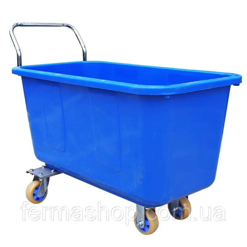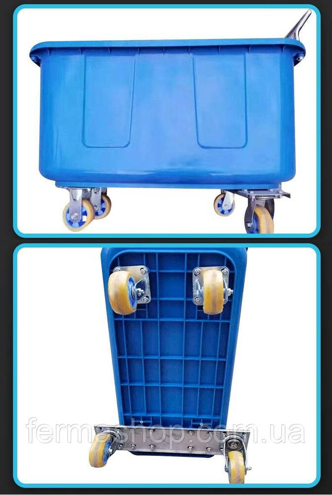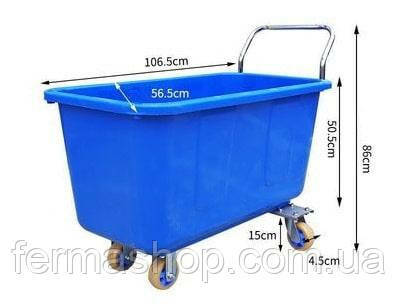 Ручка - из нержавейки. 4 колеса - 2 из них поворотные. Нижняя пластина для крепления колес - из нержавейки. Тележка из прочного пластика. Рассчитана на 150 кг груза Объем ~250 литров.