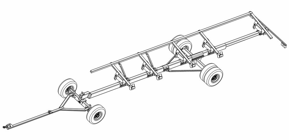 Агрегат для транспортировки жатки имеет простую конструкцию. Двухосные тележки изготавливаются с поворотной осью в исполнении как с цельной так и с разъемной рамой. В передней части тележки находится дышло, оснащенное сцепным механизмом для агрегатирования с тягачом (комбайном либо трактором).