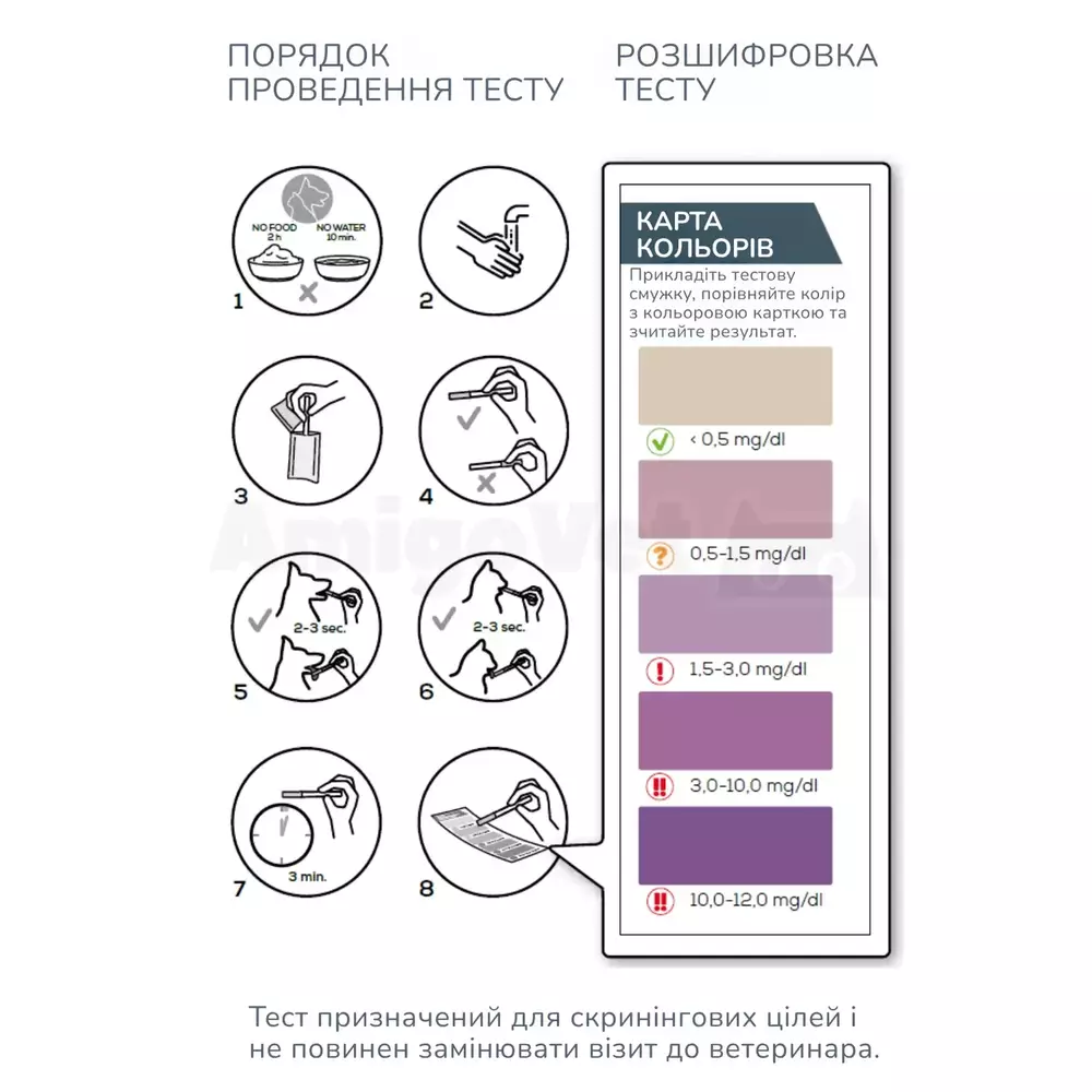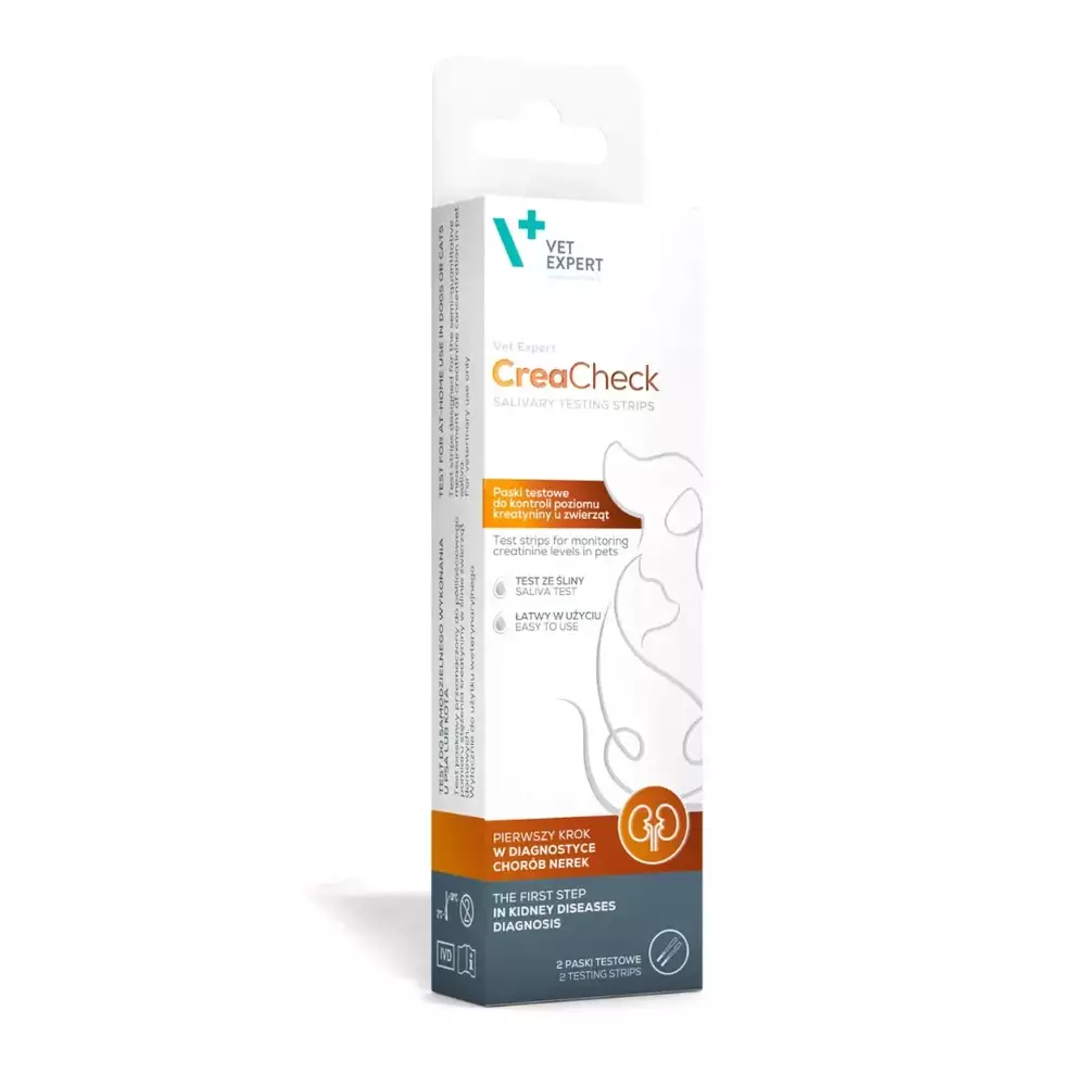 Тестові смужки Vet Expert CreaCheck – для визначення креатиніну в слині – це напівкількісний тест, призначений для вимірювання креатиніну в слині домашніх тварин (собак, котів).