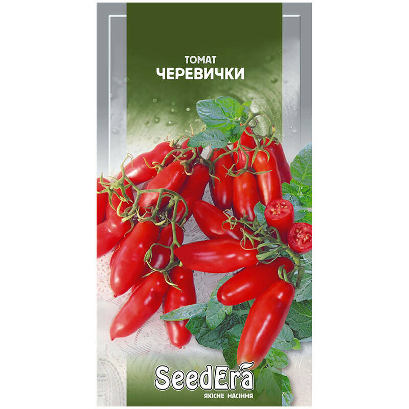 Томат Черевички - це індетермінантний сорт. Плід – сливка, за формою перцевидний, нагадує бурульку, видовжений зі злегка втягнутою всередину вершиною, довжиною 5-7 см. Кущ потужний, завішаний щільними м’ясистими плодами. На гілці зростає до 6 плодів в гронах. Забарвлення червоне, шкірка щільна. Сорт має універсальне використання, характеризується високою врожайністю. Вирощується як в теплицях, так і у відкритому грунті.