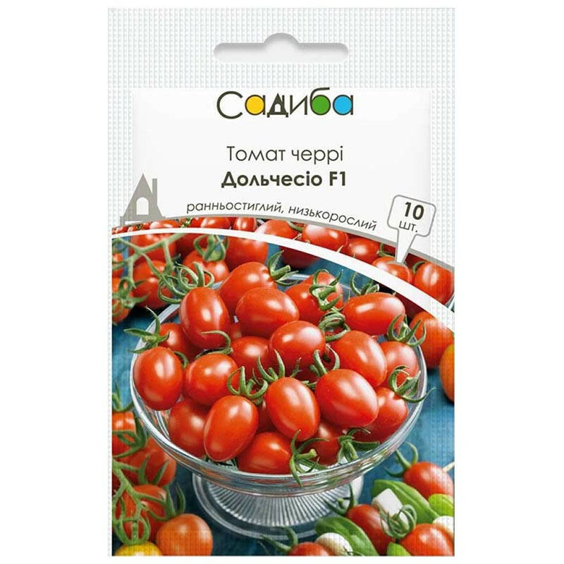 Томат Дольчесіо F1 – ранньостиглий (110-120 днів) низькорослий гібрид черрі-томатів, який поєднує високу врожайність, чудовий смак і привабливий зовнішній вигляд. Рослини міцні, низькорослі, з компактною кущовою формою та високою здатністю до зав’язування плодів. Плоди мають сливоподібну форму, яскраво-червоне забарвлення та вагу від 15 до 20 грамів. Шкірка тонка, але щільна, це робить томати стійкими до розтріскування та сприяє тривалому зберіганню. М'якуш соковитий, з чудовим солодким смаком і високим вмістом сухих речовин.