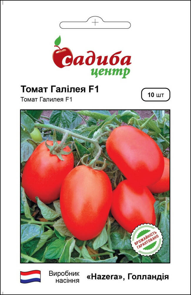 Томат Галілея - це середньоранній гібрид томату детермінантного типу, який призначений для тривалого зберігання (70 - 75 днів). Плоди овальної форми, довжиною близько 8 сантиметрів, діаметром до 5 сантиметрів, темно-червоного кольору при дозріванні.