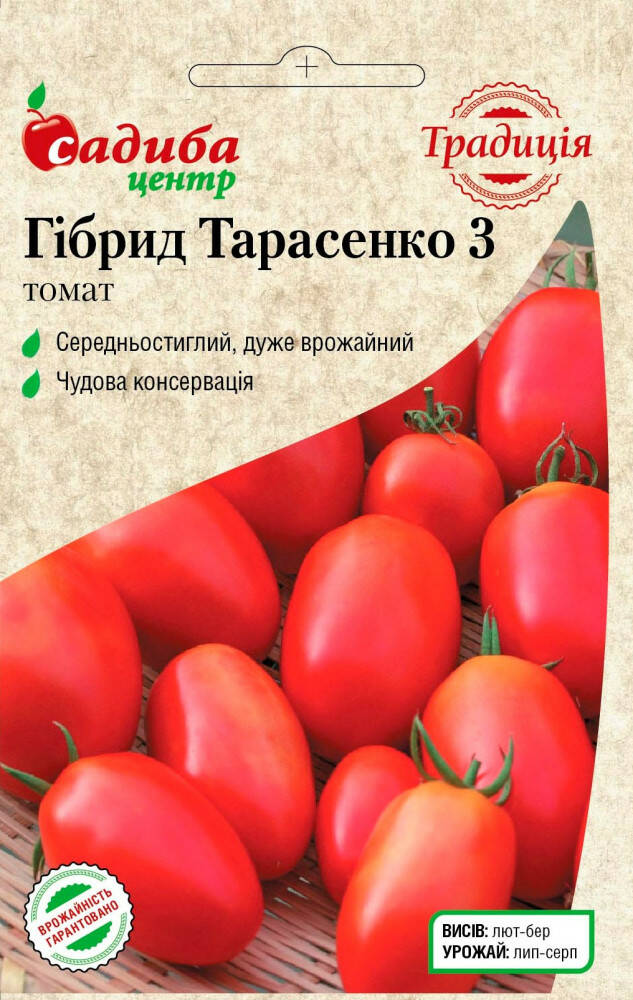 Гібрид Тарасенко 3 - сильнорослий сорт з рясним та тривалим плодоношенням! Формує крупні плоди - сливки, соковиті, м’ясисті, відмінних смакових якостей. Рослина висотою до 1,5 м, тому потребує догляду: підв’язування і пасинкування. Для свіжого споживання, консервування і зберігання.