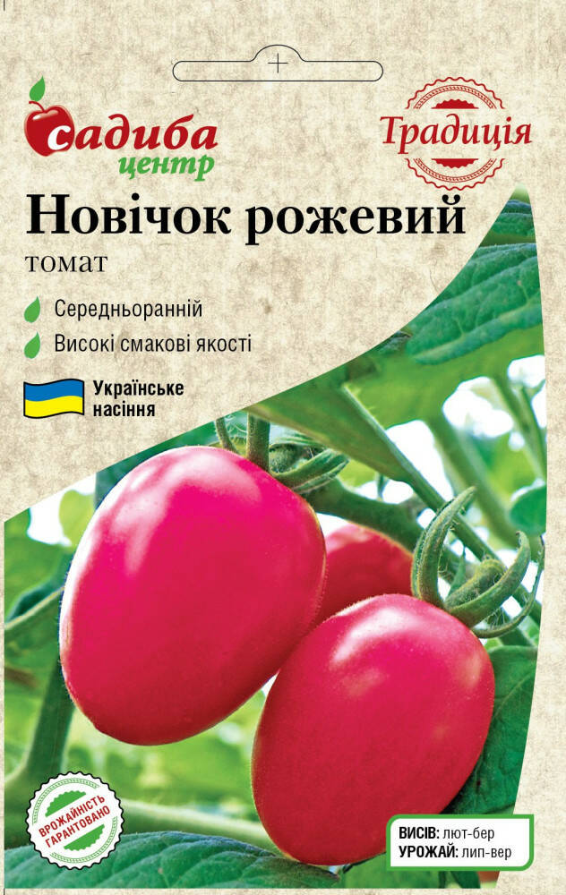 Новачок рожевий - перевірений роками сорт. Плоди злегка видовжені, рожевого кольору, м'ясисті і соковиті. Для консервування, споживання у свіжому вигляді та приготування салатів.
