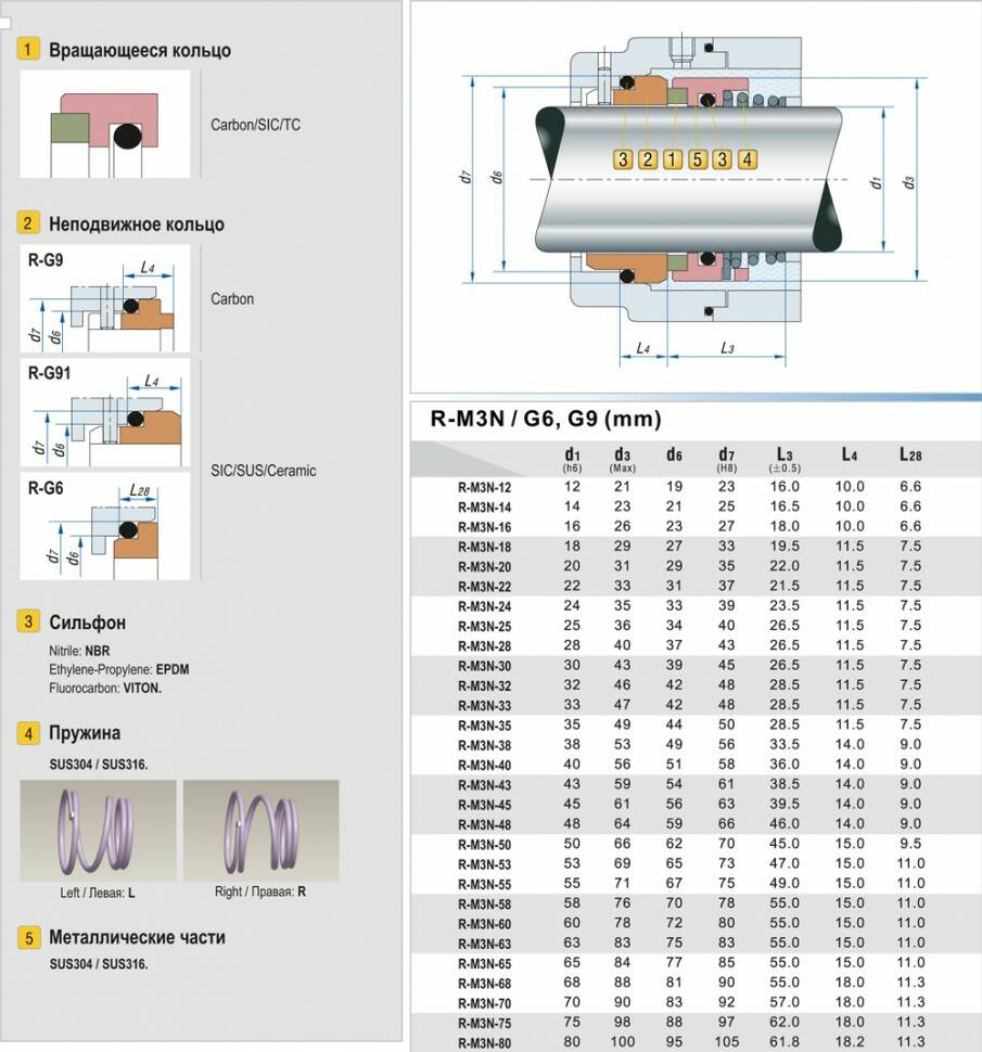 Одинарне нерозвантажене ущільнення R-M3N з конічною пружиною і одностороннім напрямком руху має широкий спектр застосування в водних, каналізаційних, погружних, хімічних насосах. Застосовується при температурах від -20 до + 180°С, з тиском до 1 МПа і швидкістю обертання до 15 м/сек.
