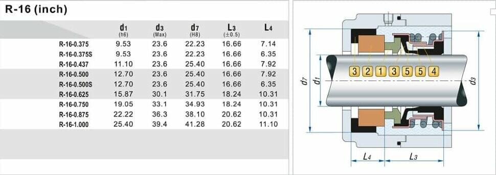 R-16 - це одинарне торцеве сильфонне ущільнення (сальник) до дюймових валів. Використовується при температурах від -30 до + 180°С, з тиском до 1 МПа і швидкістю обертання до 10 м/сек.