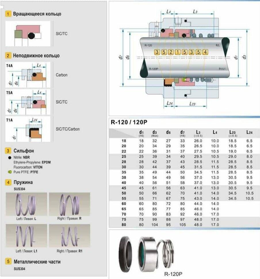 Механічне, торцеве ущільнення R-120P використовується при температурах від-40 до + 180°С, з тиском до 1 МПа і швидкістю обертання до 10 м/сек.