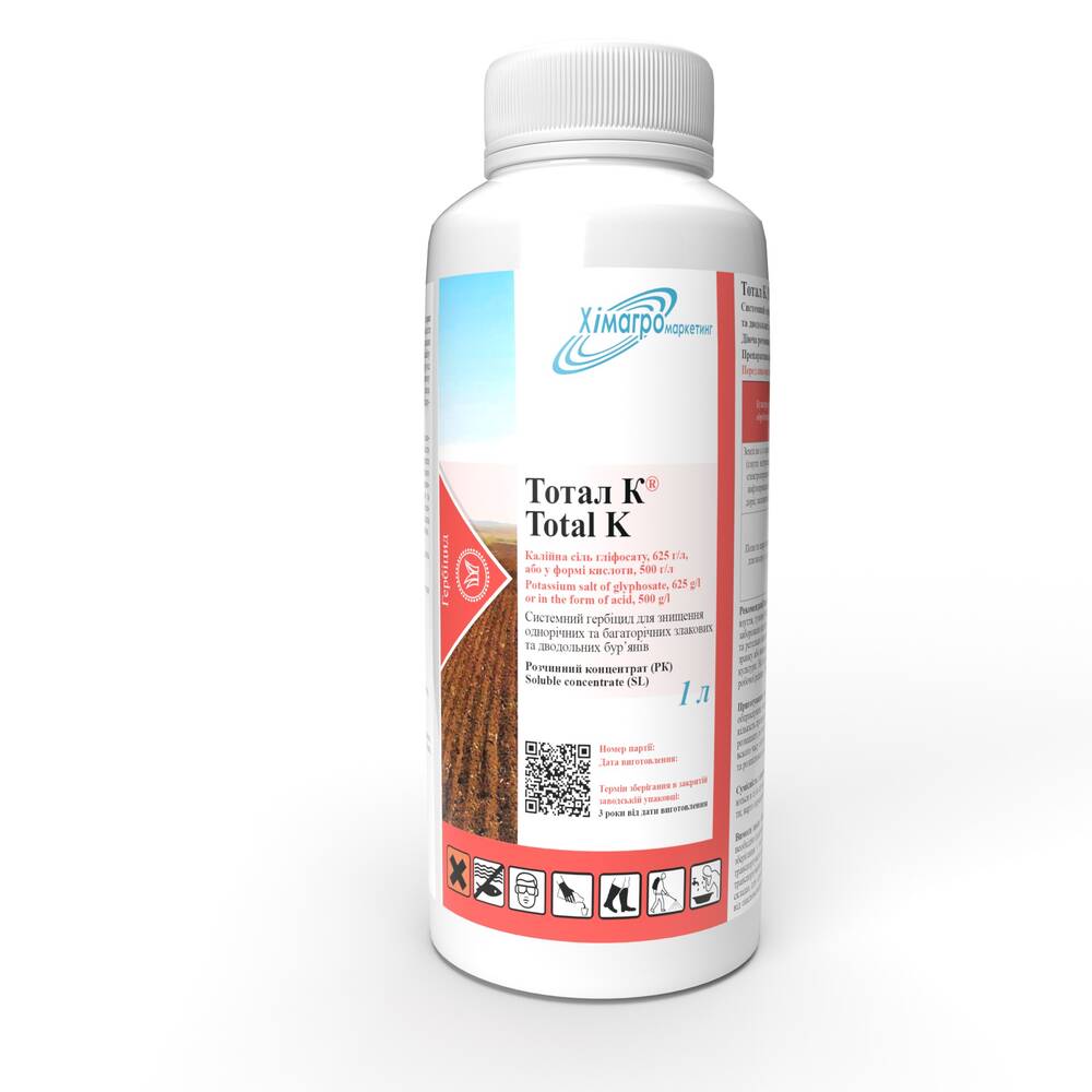 діюча речовина, потрапляючи на вегетуючі зелені частини бур’янів (листя, стебла), послаблює міжкутикулярні зв’язки, що дозволяє поглинути препарат паренхімою з подальшим переміщенням по всіх органах з інгібуванням синтезу амінокислот, необхідних для росту і розвитку бур’янів, а це призводить до повної їх загибелі в тому числі і кореневої системи. Тотал к застосовується лише по активно вегетуючих бур’янах і не діє на рослини, котрі проросли після застосування гербіциду.