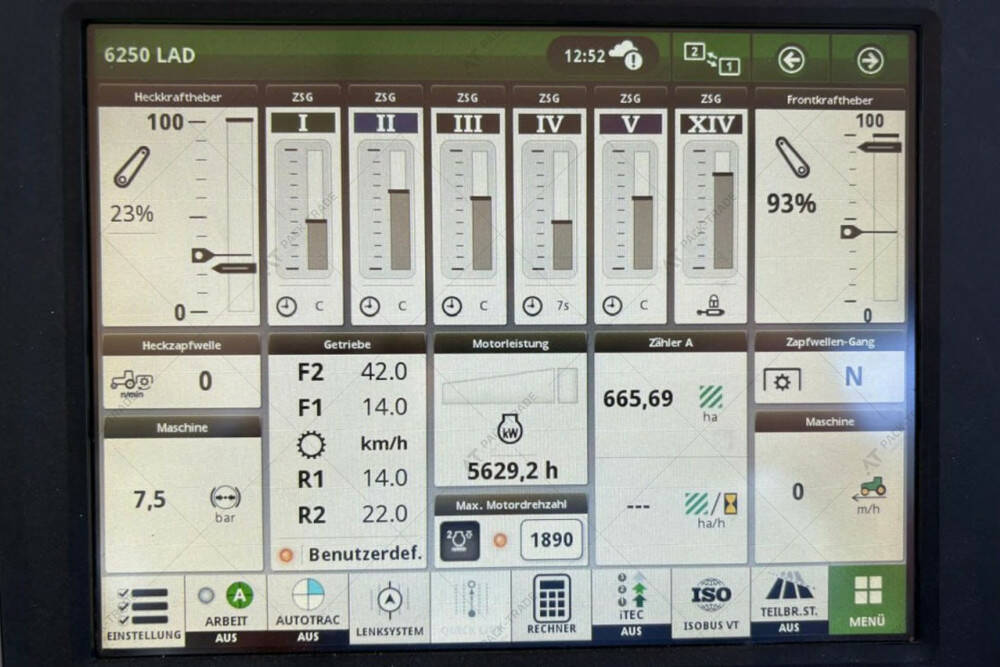 Дизельний трактор б/в John Deere 6250R, 2019 р/в, з напрацюванням 5632 м/год. Тип двигуна Дизель. Потужність 250 к/с. Габаритна Ширина-3.0 м. Висота- 3,3 м. Довжина- 5,3 м. Шини: 620/75R30, 900/60 R42. КПП-IVT, 5 пар SCV. PowrBeyonde. Пневматичні гальма. Гідравлічна центральна тяга. Передня навіска та ВВП. 2 пари SCV спереду. Додатковий монітор. Електричне регулювання дзеркал. Активації: AutoTrac, Section Control, документування, синхронізація даних.