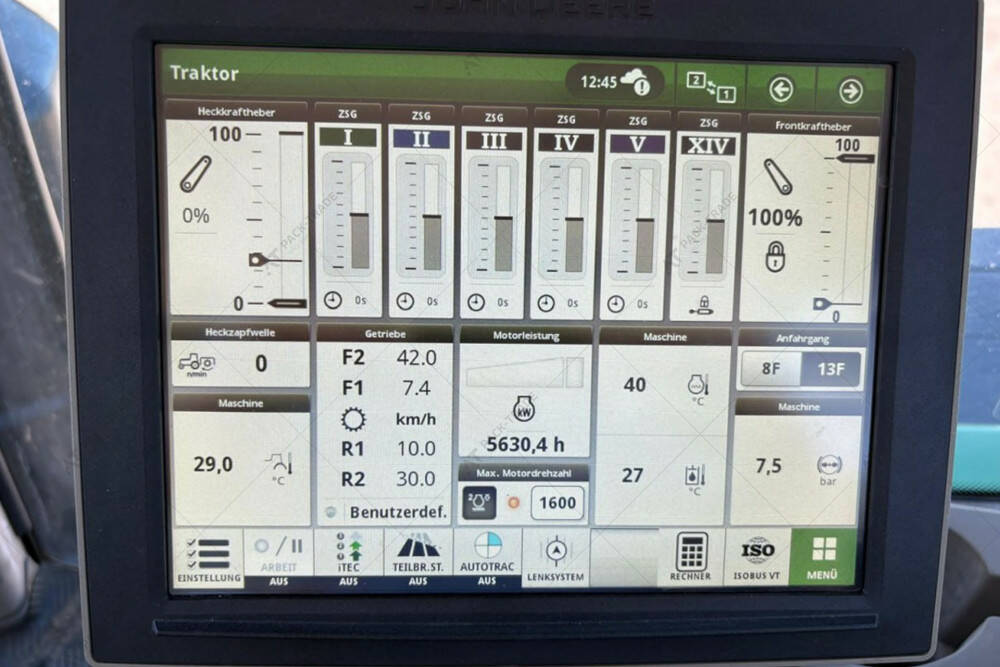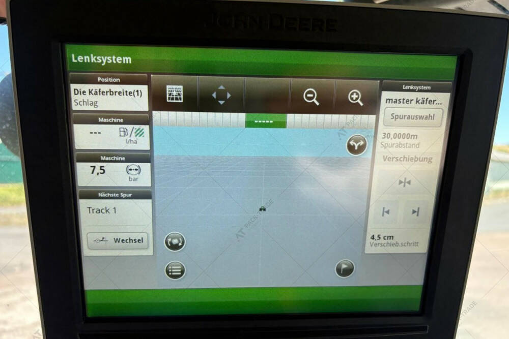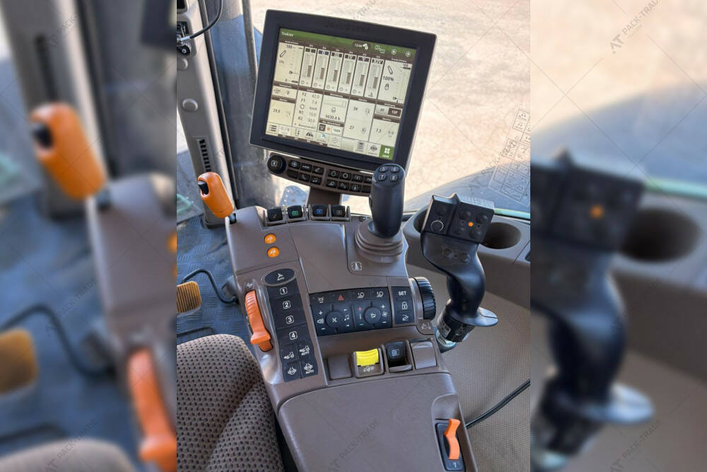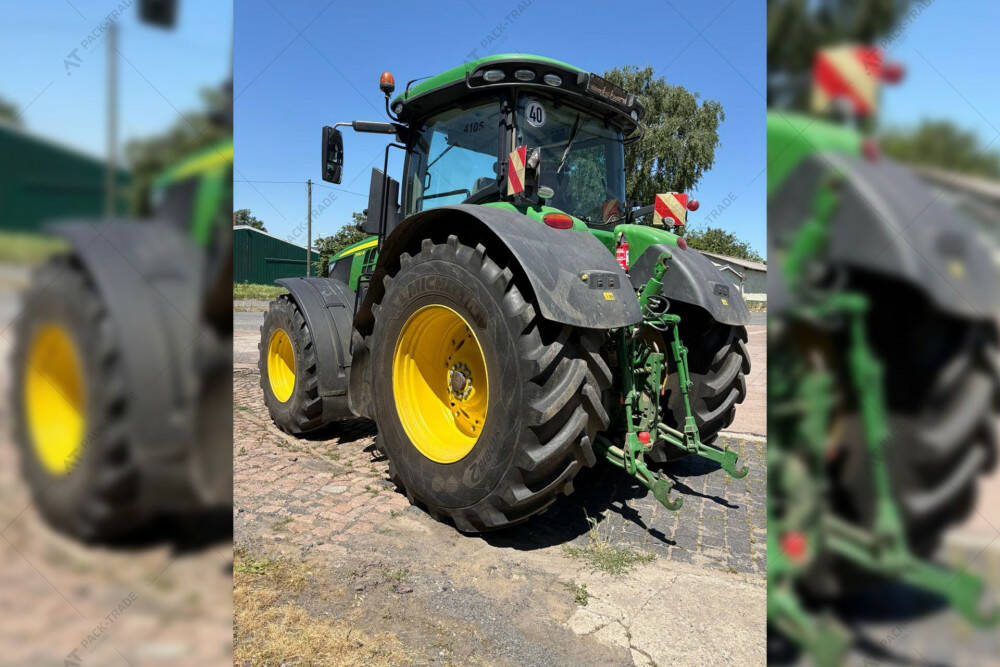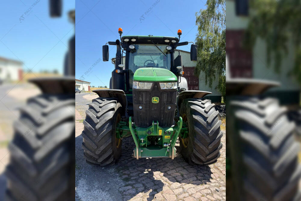 Дизельний трактор б/в John Deere 7R310, 2020 р/в, з напрацюванням 5634 м/год. Тип двигуна Дизель 310 к/с. Шини: Michelin VF 710/75 R 42, Michelin IF 620/75 R 30. AutoTrac, Section Control. Передня навіска CAT3 без центральної тяги. Задня тяга гідравлічна. Компресор. Авто фаркоп. Холодильник. Додатковий монітор. Авто розворот.