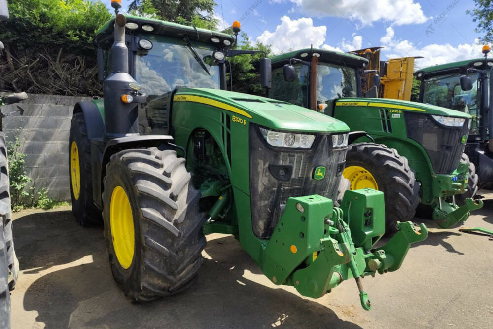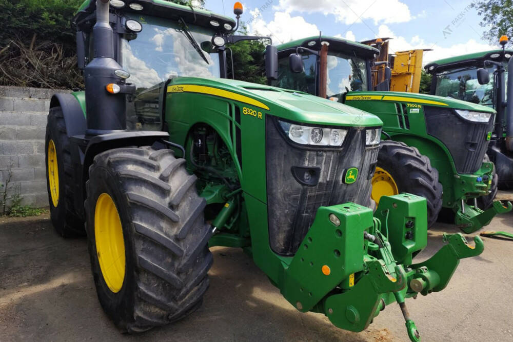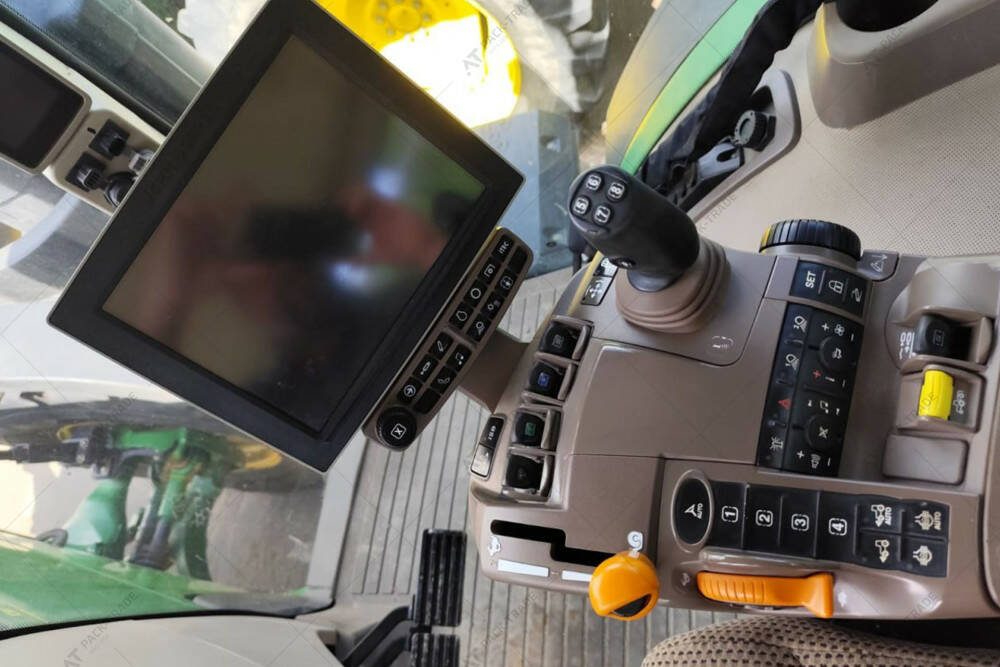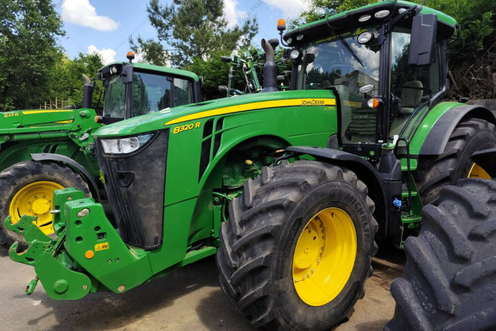 Дизельний трактор б/в JOHN DEERE 8320R, 2020 р/в, з напрацюванням 4910 м/год. Потужність двигуна – 320 к.с. КПП – AutoPower, розетка ISOBUS, гідравлічні гальма, джойстик ISOBUS, електричне регулювання дзеркал, 4 пари гідровиходів SCV ззаду, 1 пара гідровиходів спереду, передня навіска, клімат-контроль, передній міст ILS, ВВП 1000-1000E, двірник і шторка спереду, ззаду та праворуч, шини передні 600/70R30, шини задні 650/85R38, активації – автотрак та документування.