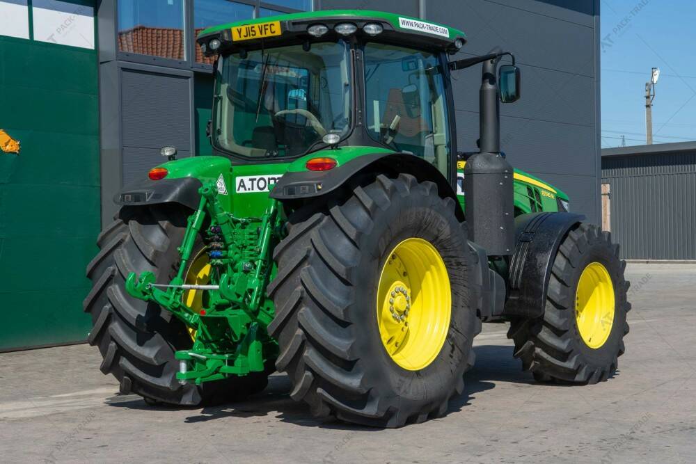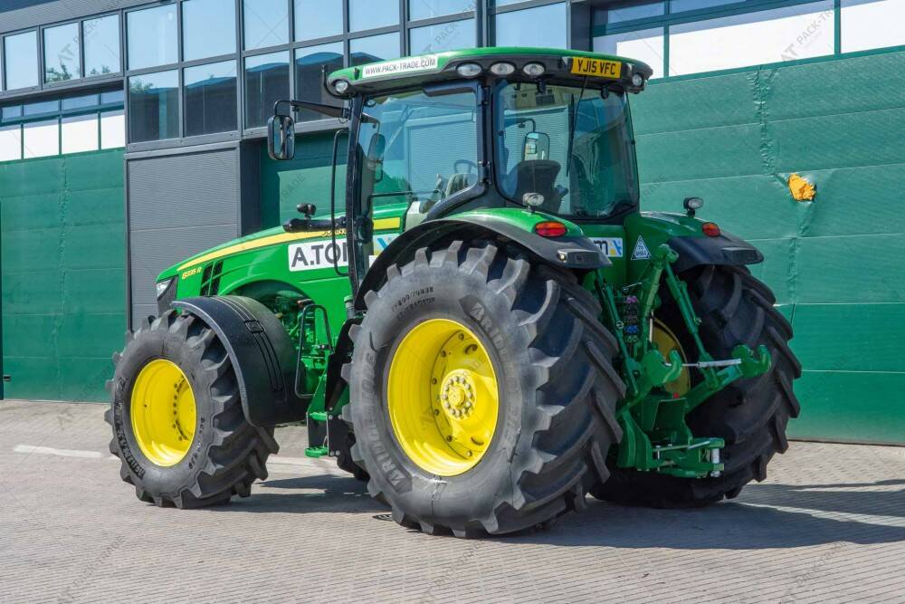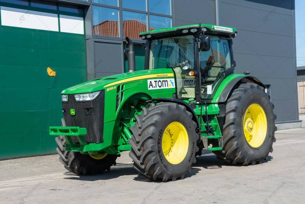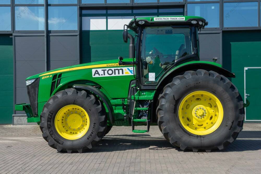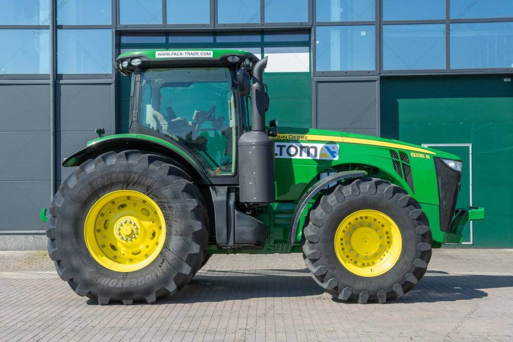 Дизельний трактор б/в John Deere 8335R, 2013 р/в, з напрацюванням 5401 м/год. Потужність двигуна – 335 к.с. ВВП (1000 обертів), Коробка AutoPower, Передній міст ILS, Монітор Green Star 3, Розетка ISOBUS, Навіска задня 3-ох точкова Cat4, Кількість гідровиходів – 5, Догрузи задні внутрішні по 625 кг, Електрорегулювання дзеркал – є, шини передні 600/70R30 задні 800/70R38. Додаткове робоче освітлення. Кліматконтроль. Передній міст ILS.