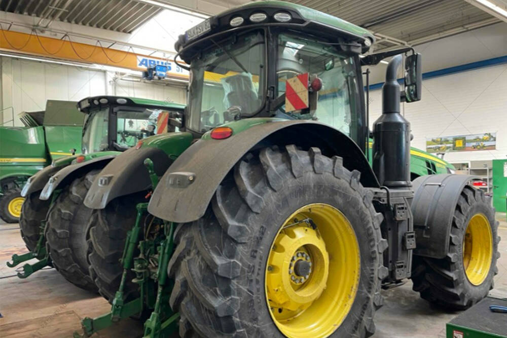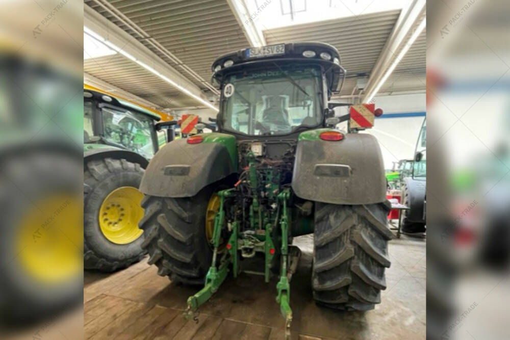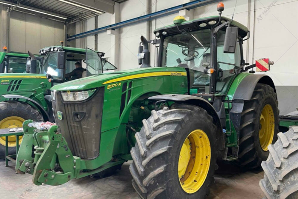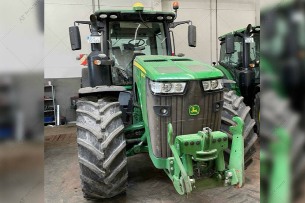 Трактор б/в John Deere 8370R, 2018 р/в, з напрацюванням – 6922 м/год. Коробка передач E23.Передній міст - ILS, холодильник, електричне регулювання дзеркал, правий двірник та шторка, 5 пар SCV, PoverBeyond, ISOBUS, задня навіска Cat4, пневматичні гальма, розетка ABS. Задні догрузи зовнішні та внутрішні. Передня гума 650/60R34 Задня гума 900/60R42, Активації - Автотрек та документування. Кліматконтроль.