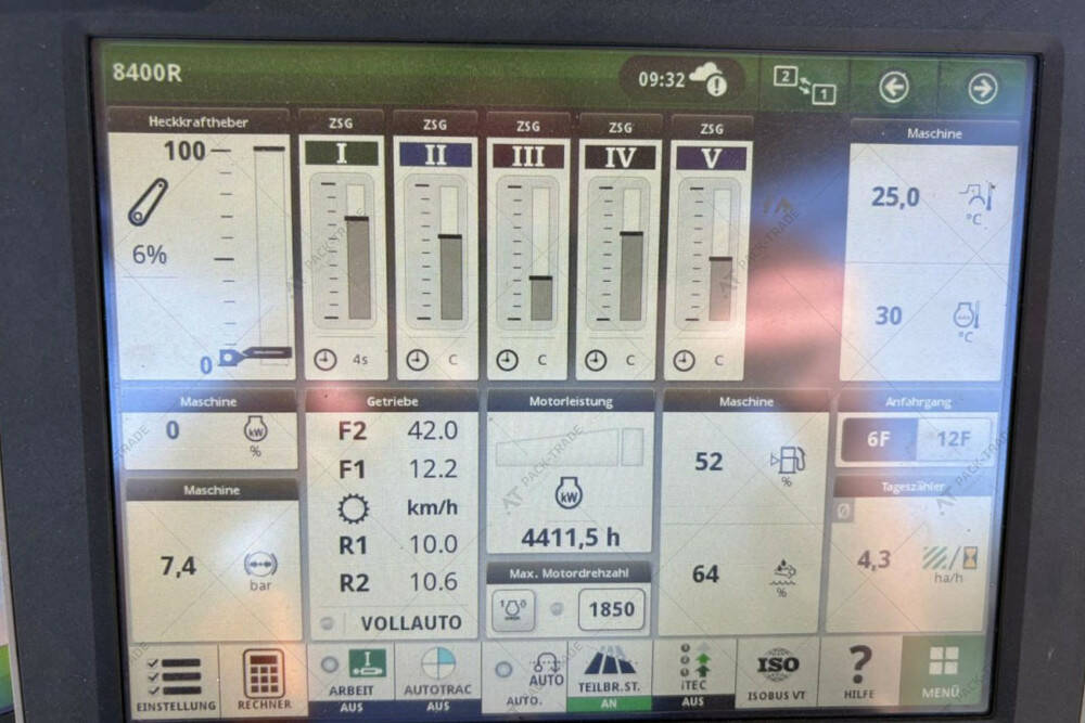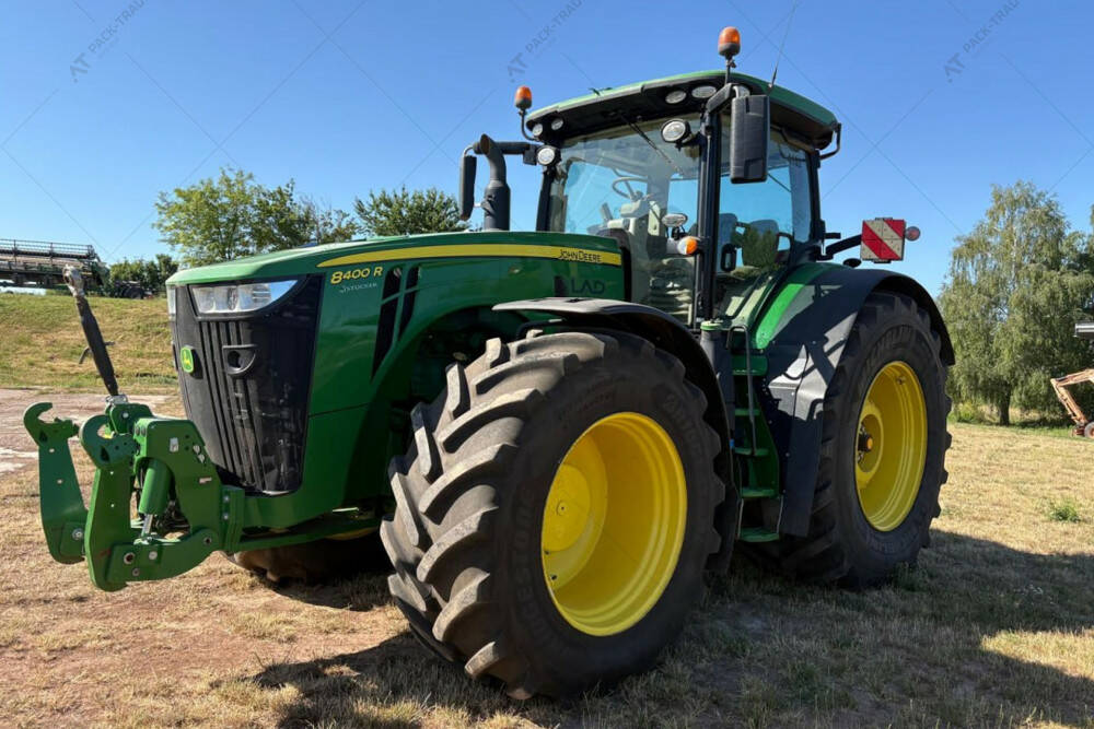 Дизельний трактор б/в John Deere 8400R, 2020 р/в, з напрацюванням 4413 м/год. GPS-антена SF6000, додатковий монітор, гідравлічна центральна тяга, передня навіска, холодильник, магнітола, AutoTrac, Section Control, рамка 390 мм K80, компресор.