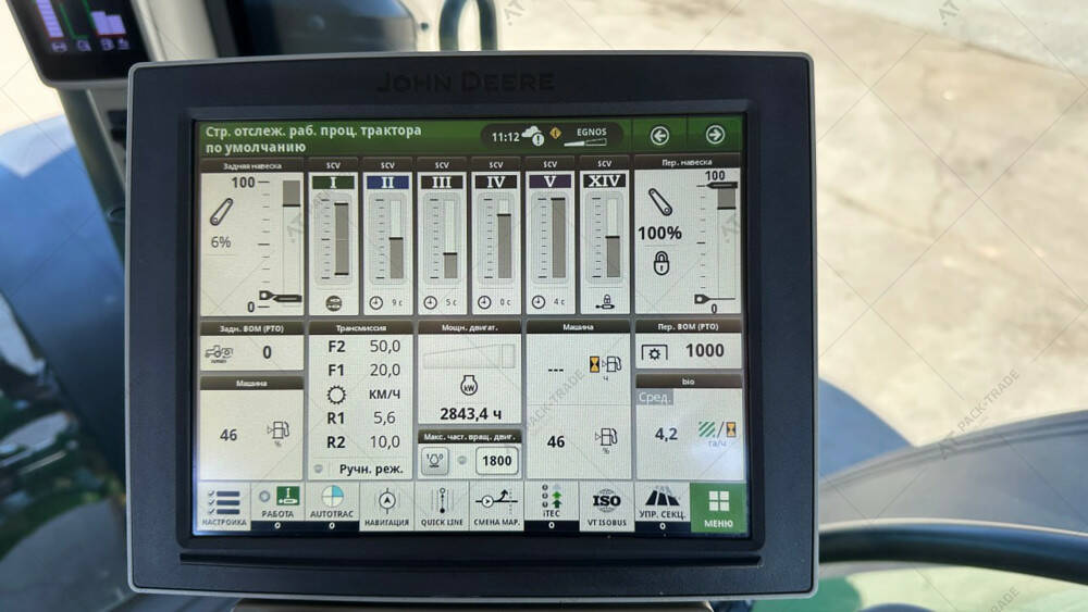 5 пар SCV, PoverBeyond, ISOBUS, задня навіска Cat4, гідравлічна центральна тяга ззаду, гідравлічні та пневматичні гальма, розетка ABS. Передня навіска, 1 пара гідровиходів спереду. Активації: Auto Trac, документування, керування секціями. Інтегрована GPS та RTK антени. Передня гума 650/60R34 Задня гума 900/60R42.