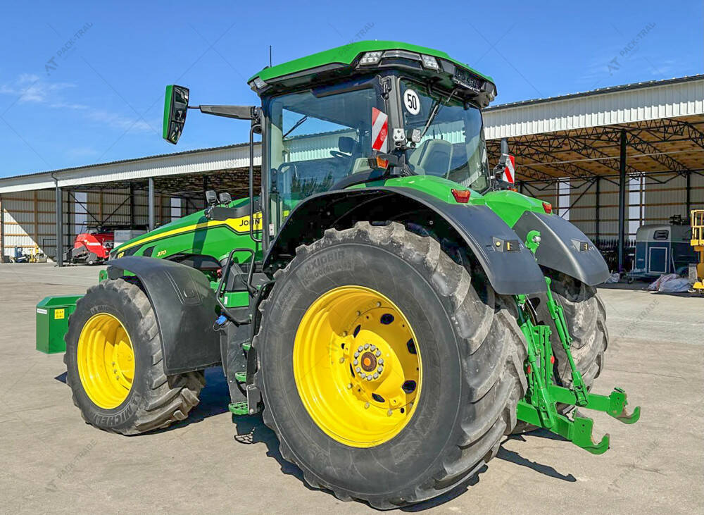 Трактор б/в John Deere 8370R, 2020 р/в, з напрацюванням – 2871 м/год. Коробка передач E23.Передній міст - ILS. Захист сухого ходу турбокомпрессора. Салон кабіни ULTIMATE EDITION комплектація, джойстик ISOBUS, холодильник, електричне регулювання дзеркал, правий двірник та шторка, шкіряне сидіння, радіостанція, LED світло, світло для обслуговування з усіх боків трактора.