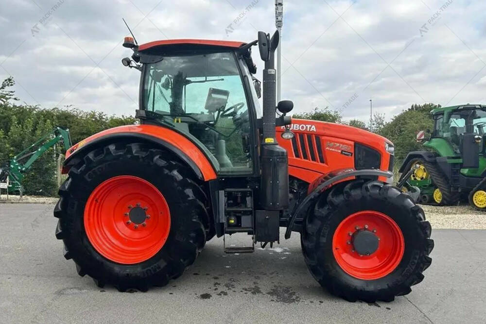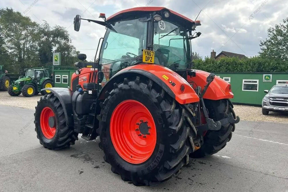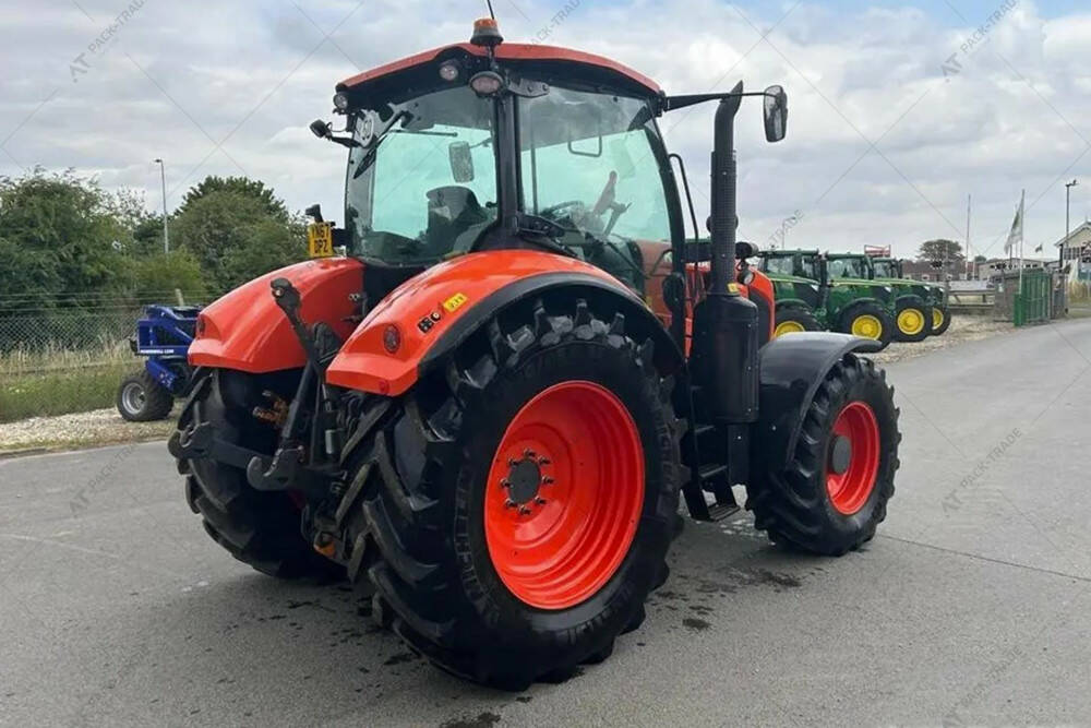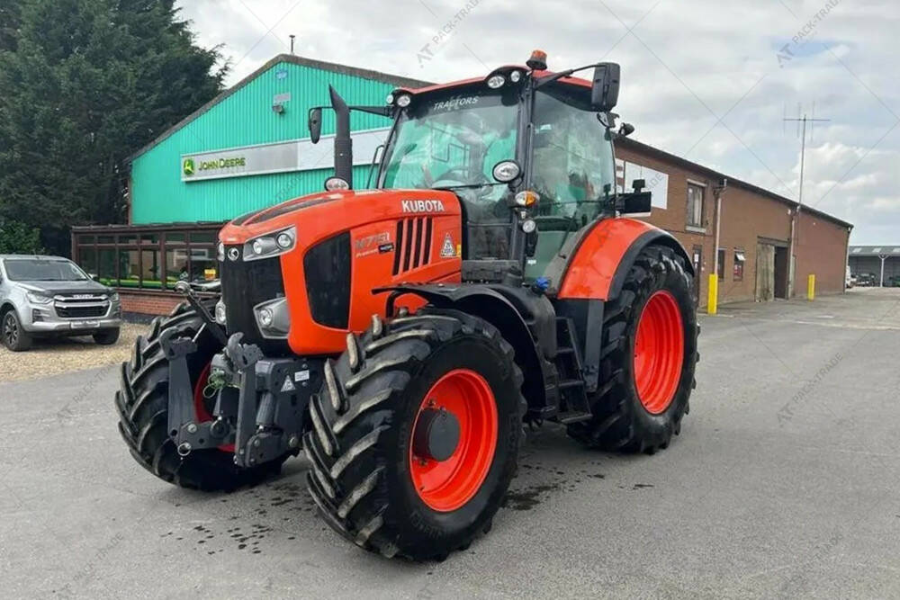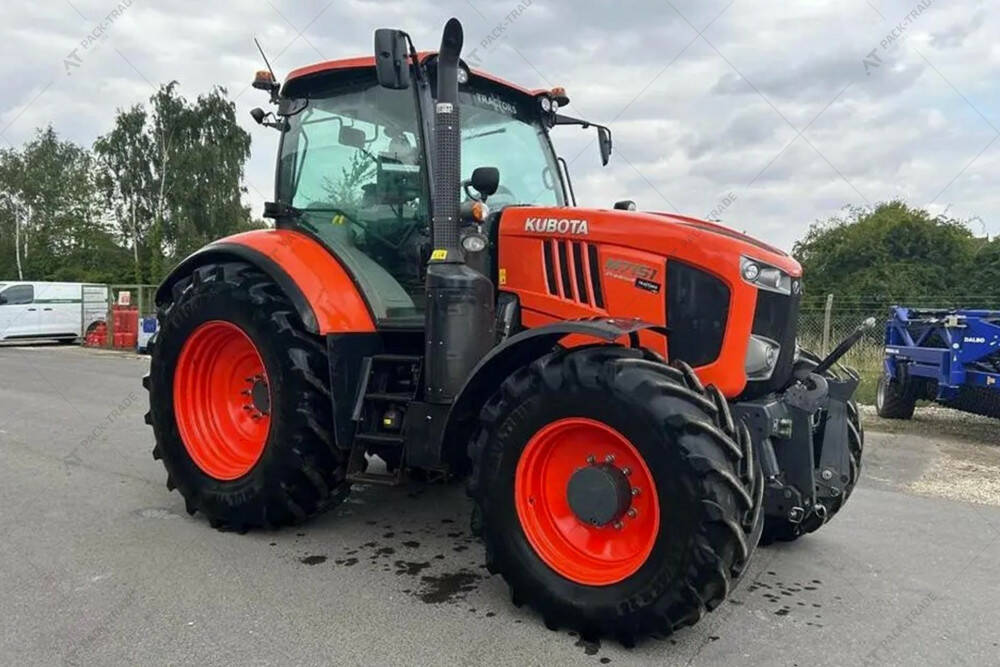 Дизельний трактор б/в KUBOTA M7151, 2017 р/в, з напрацюванням 2074 м/год. Максимальна швидкість – 40 км/год. Двигун — 125.4 кВт. Передня навіска. Передній ВВП. 4 пари SCV. Компресор. Розетка ISOBUS. Шини: пер. 540/65R28, зад. 650/65R38. Кондицінер. Ходозменшувач.