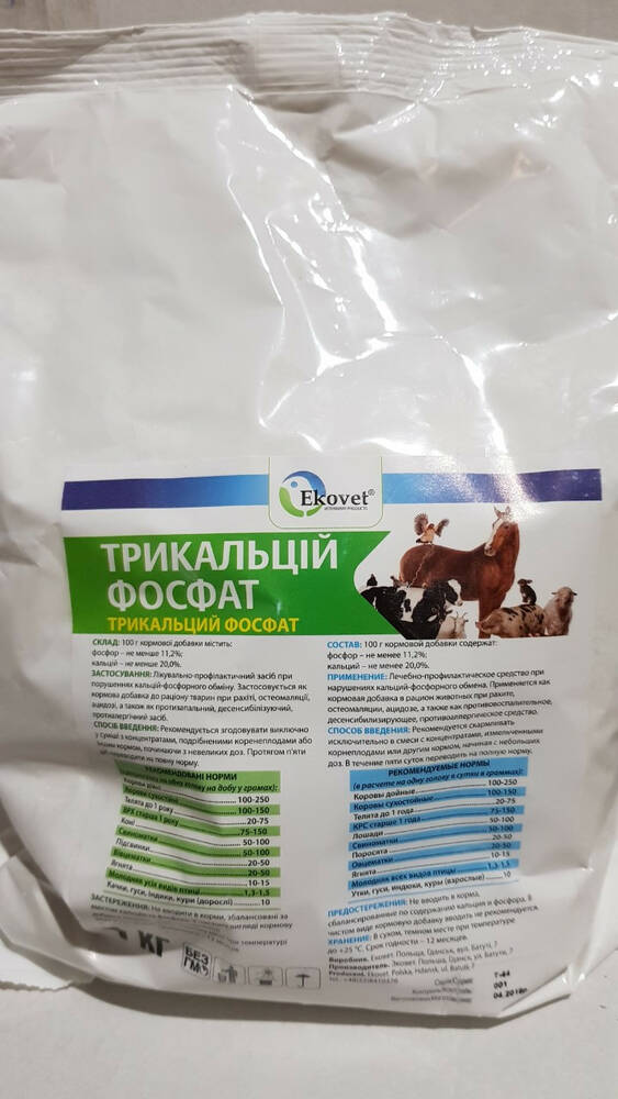 Трикальцій фосфат 1 кг - лікувально-профілактичний засіб при порушення кальцій-фосфорного обміну. Застосовується як кормова добавка в раціон тварин при рахіті, остеомаляції, ацидозі, а також як протизапальний, десенсибілізуючий, протиалергічний засіб.