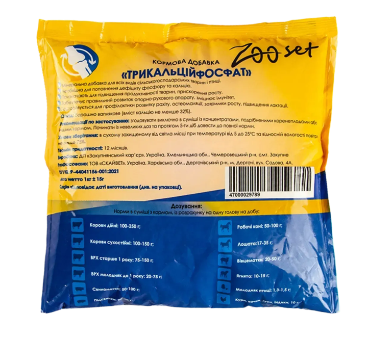 Трикальційфосфат містить ідеальне співвідношення фосфору і кальцію, тому його застосування у складі комбікормів і присутність у раціонах годівлі підвищує ефективність всього процесу.