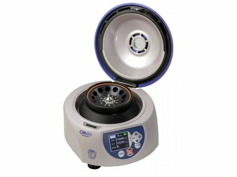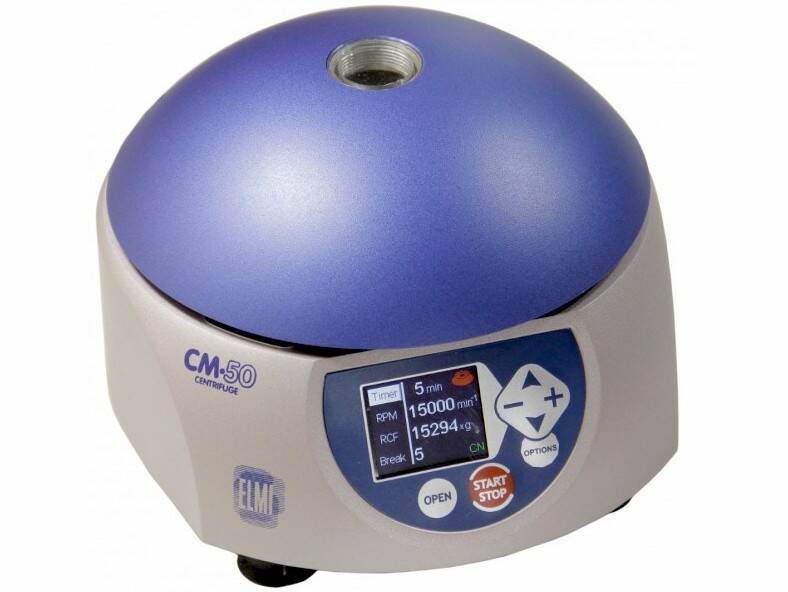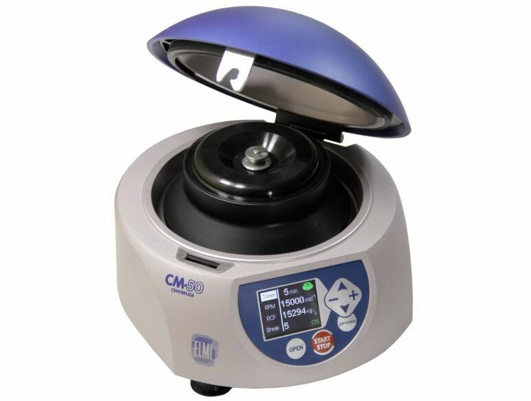 Лабораторна центрифуга СМ-50 Elmi укомплектована кутовим ротором. Ємність ротора - 12 пробірок Eppendorf. Об'єм розміщуваних пробірок від 0,5 до 2 мл. Дана центрифуга знайшла широке застосування в лабораторіях медицини, ветеринарії, біології, завдяки простій і надійній конструкції на додаток до цифрової системи управління. Мінімальні габарити центрифуги СМ-50, простота в управлінні, практична відсутність шуму і вібрації забезпечують високу продуктивність і зручність в роботі.