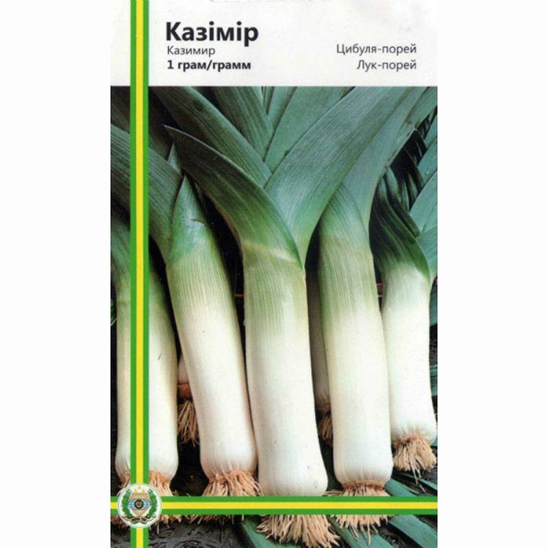 Цибуля-порей Казимир - це високоврожайний пізньостиглий сорт з високою якістю продукції. Період вегетації, від повних сходів до збирання, близько від 180 до 200 днів. Рослина висока. Листя розташоване майже вертикально, темно-зеленого забарвлення. Вибілена частина стебла білосніжна завдовжки 22-26 см, діаметром 3,0-3,5 см, цибулина відсутня або слабо виражена. Наявність слабовираженої цибулини полегшує очищення продуктивної частини рослини та збирання. Сорт характеризується відмінними смаковими якостями, добре транспортується та зберігається.