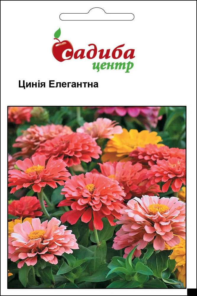 Цинія Елегантна - однорічна швидкоростуча рослина висотою 50 см. Суцвіття великі, кулястої форми, махрові і мають рожеве, червоне, фіолетове, біле і жовте забарвлення. Розмножують насінням, яке висівають у парники в квітні. Сходи з'являються на 4 - 6 день. Пікірують один раз. На постійне місце висаджують на відстані 20 - 35 см. Після пересадки рослина добре приживається. Можна висівати безпосередньо на постійне місце наприкінці квітня - початку травня. Цвіте цинія рясно і тривало, з середини червня до морозів. Теплолюбна, найкраще росте на відкритих сонячних місцях, родючих ґрунтах і при рясному поливі. Вирощують на клумбах, рабатках, в групових посадках і для зрізу.
