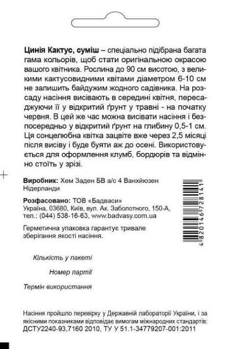 Цинія Кактус, суміш – спеціально підібрана багата гама кольорів, щоб стати оригінальною окрасою вашого квітника. Рослина до 90см висотою, з великими кактусовидними квітами діаметром 6-10см не залишить байдужим жодного садівника. На розсаду насіння висівають в середині квітня, пересаджуючи її у відкритий ґрунт у травні - на початку червня. В цей же час можна висівати насіння і безпосередньо у відкритий ґрунт на глибину 0,5-1см. Ця сонцелюбна квітка зацвіте вже через 2,5 місяці після висіву і буде буяти аж до осені. Використовується для оформлення клумб, бордюрів та відмінно стоїть у зрізі.